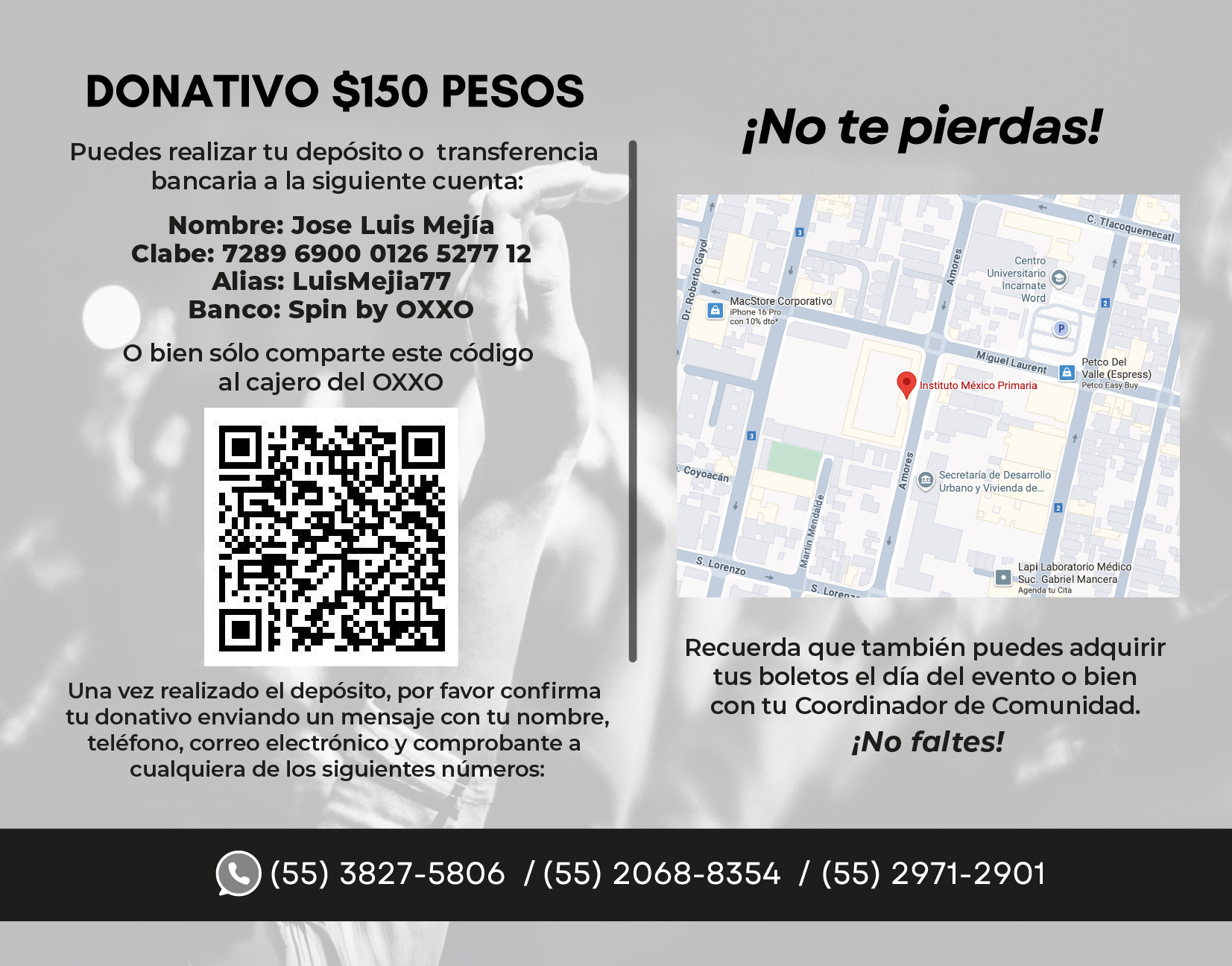 El donativo no es una “cuota”, sino una colaboración fraterna para cubrir los costos del evento (audio, sillas, materiales, renta del lugar, etc.). Nadie se quedará fuera por motivos económicos: si necesitas apoyo, acércate a tu coordinador o mándanos un mensaje.